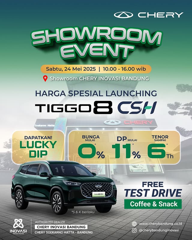 📍 Kunjungi showroom Chery Bandung City mall sekarang dan rasakan sensasi berkendara dengan mobil Chery yang stylish, nyaman, dan bertenaga!